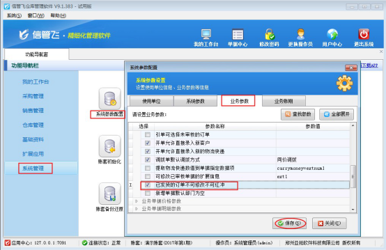 在功能導航窗點擊“系統(tǒng)管理”→“系統(tǒng)參數設置”→“業(yè)務參數”可以打開“業(yè)務參數”配置界面,在業(yè)務單據相關參數內打鉤啟用“已發(fā)貨的訂單不可修改不可紅沖”參數,然后點擊“保存”按鈕保存設置,如下圖1所示。