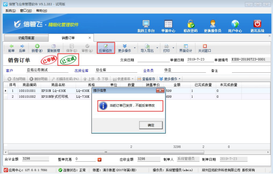 歡迎下載試用可控制訂單發(fā)貨完成不允許修改和紅沖功能的軟件:信管飛倉庫管理軟件