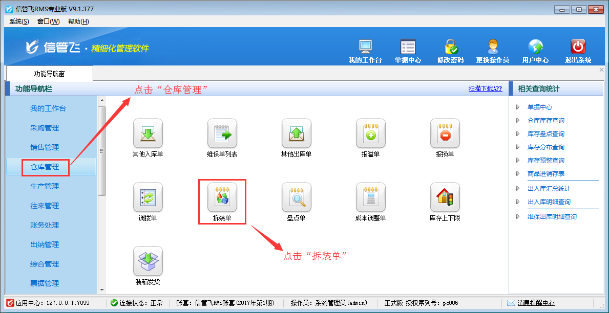 信管飛RMS及信管飛倉庫管理軟件都支持拆裝單,拆裝單用于處理進貨時為組件、配件、原料等,但銷售時卻是成套銷售的,比如電腦經銷商,采購的是電腦配件,但實際銷售的是整機。也有購入的是整機,但銷售的時候是按單個配件進行銷售的情況,也可以使用拆裝單進行處理。