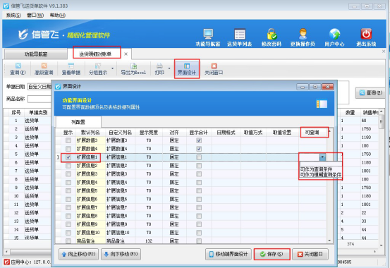 以“送貨明細(xì)對賬單”為例,示范下如何在界面設(shè)計中配置。功能導(dǎo)航窗選擇“業(yè)務(wù)處理”在右側(cè)的查詢統(tǒng)計下打開“送貨明細(xì)對賬單”進(jìn)入送貨明細(xì)對賬單界面,點擊“界面設(shè)計”按鈕,在打開的界面設(shè)計窗口中找到“擴(kuò)展信息1”數(shù)據(jù)項,勾選顯示并在可查詢處設(shè)置“可作為查詢條件”,然后保存設(shè)置,如下圖所示:
