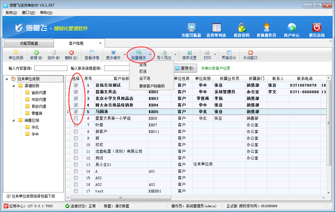 在功能導航窗選擇“基礎資料”—》“客戶信息”進入客戶信息管理界面,選擇工具欄的“批量操作”按鈕,進入批量操作模式,選擇需要刪除的客戶信息(批量操作支持全選、全不選、反選),如下圖所示:
