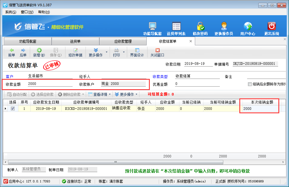 注意:收款結算單單據明細中“本次結銷金額”的合計金額,必須等于可結銷金額(收款金額 + 優惠金額),否則無法保存收款結算單。