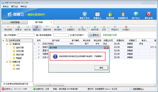 信管飛RMS軟件是集采購管理、銷售管理、庫存管理、往來賬管理等為一體的進銷存管理軟件。經(jīng)常會有用戶問到刪除客戶資料時會彈出提示信息:“當(dāng)前選擇的往來單位在單據(jù)中有使用,不能刪除”(如下圖一所示),刪除不了,為什么?