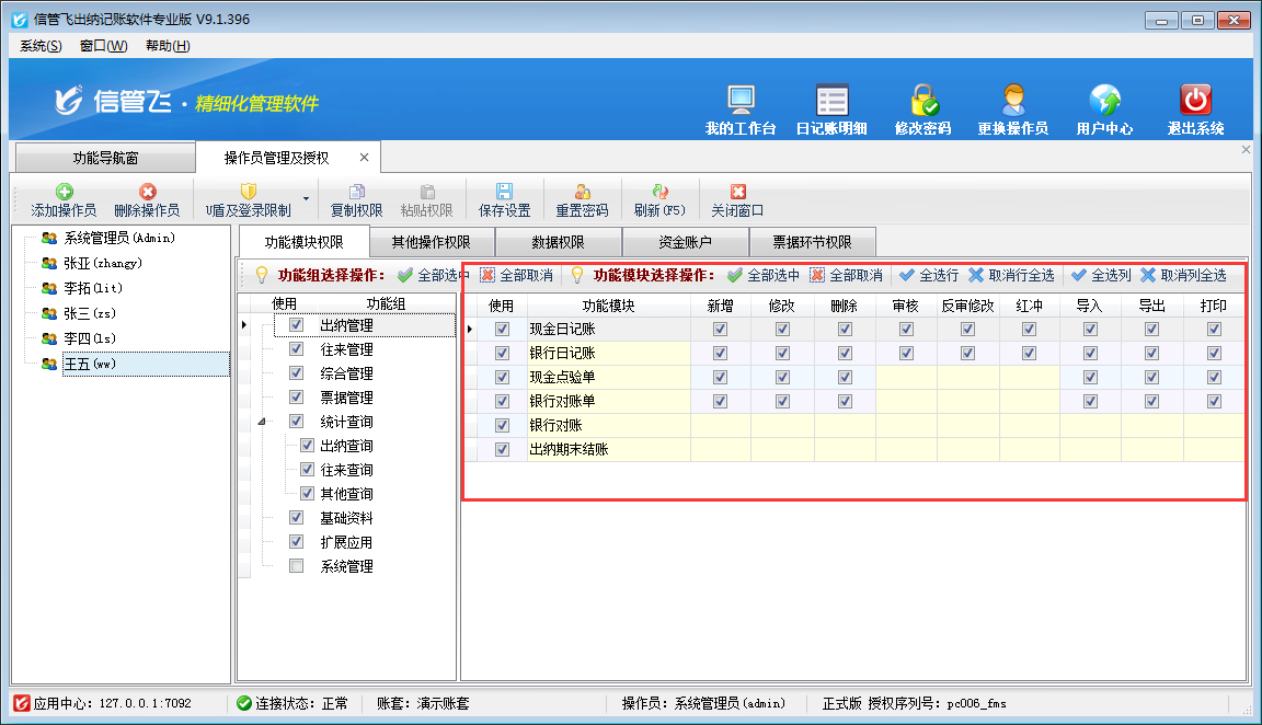 設置操作員權限:操作員賬號添加后,請選中操作員賬號,然后在其右側可以設置操作員可操作的功能模塊權限、數據權限及其他操作權限。設置功能模塊權限的時候,注意功能模塊權限打勾選擇“使用”后,還需要設置詳細的操作權限(如新增、刪除、審核、反審修改、紅沖、導入、導出、打印等),如果不設置詳細的模塊操作權限,則只能進入功能模塊,但無法執行任何操作。