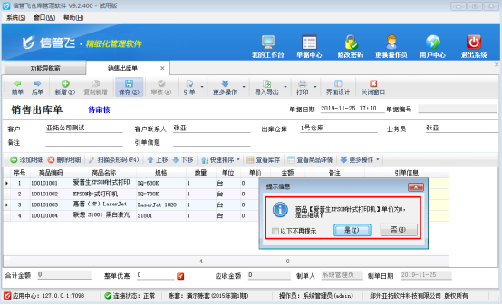 信管飛RMS、信管飛倉庫管理軟件、信管飛送貨單軟件等在業(yè)務(wù)單據(jù)保存時如果商品單價為0,系統(tǒng)會彈出提示信息,是否需要繼續(xù)保存,如下圖1所示,這樣以免用戶在添加商品明細時忘了填寫單價,好及時錄入,但是有一部分用戶在開單據(jù)時只需要填寫商品數(shù)量,不需要填寫單價,該怎么設(shè)置系統(tǒng)才能不彈出以下提示信息呢?本篇文章以信管飛倉庫管理軟件為例介紹一下如何設(shè)置出庫單保存時商品單價為0系統(tǒng)不彈出提示信息?