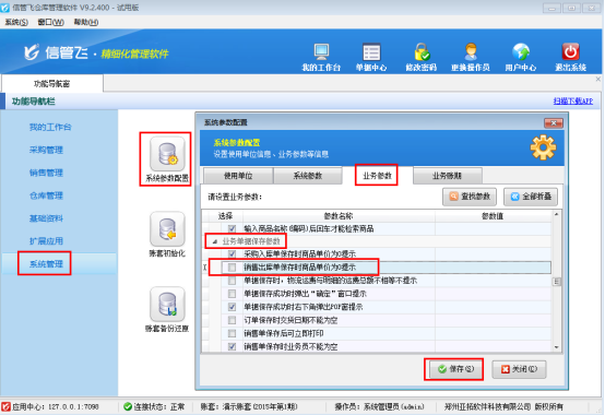 在功能導(dǎo)航窗點擊“系統(tǒng)管理”—》“系統(tǒng)參數(shù)配置”—》“業(yè)務(wù)參數(shù)”,即可進入到“業(yè)務(wù)參數(shù)”配置界面,在業(yè)務(wù)單據(jù)保存參數(shù)內(nèi)找到“銷售出庫單保存時商品單價為0提示”參數(shù),把這個參數(shù)的勾選去掉,然后保存設(shè)置,如下圖2所示。
