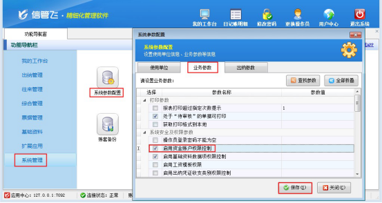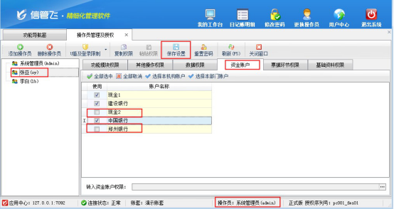 在功能導航窗選擇“系統管理”—》“系統參數配置”—》“業務參數”進入業務參數配置界面,在系統安全及權限設置中勾選“啟用資金賬戶權限控制”參數,如下圖所示:參數“啟用資金賬戶權限控制”啟用成功后,使用系統管理員登錄軟件,在功能導航窗選擇“系統管理”—》“操作員及授權”進入操作員及授權管理界面,在權限模塊中可看到啟用的“資金賬戶權限”,添加操作員“張亞”,選擇操作員“張亞”后,打開資金賬戶權限,設置操作員“張亞”沒有“現金2和鄭州銀行”權限,保存設置,如下圖所示:
