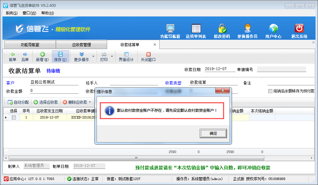 收款結算單用來登記收款信息(收款對象即客戶、收款賬戶、收款金額、經(jīng)手人等),并結銷應收款記錄。部分用戶在剛開始使用送貨單軟件對軟件功能不熟悉,首次對應收款進行收款結算,錄入收款金額時會提示:默認收付款資金賬戶不存在,請先設定默認收付款資金賬戶!(如下圖所示)無法繼續(xù)填開收款結算單。