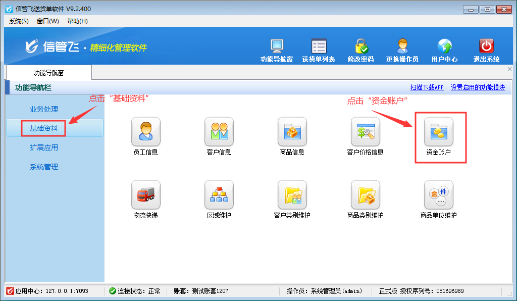 這種情況是因為在系統(tǒng)內沒有維護收款賬戶導致的,請在功能導航窗點擊“基礎資料”—》“資金賬戶”打開資金賬戶管理界面增加資金賬戶即可,如下圖所示。