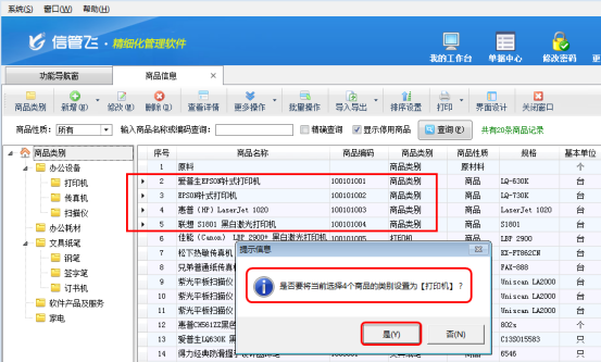 以圖1為例,要把第2行至第5行商品類別是“商品類別”的4條記錄的商品類別改為“打印機”。首先點擊第2行記錄,然后按下Shift鍵不松手時鼠標點擊第5行記錄,這樣就可以同時快速選中第2行至第5行這4條記錄,選中多條記錄后,再按住鼠標左鍵不松手,移動到商品類別“打印機”處,此時系統(tǒng)會提示“是否要將當前選擇4個商品的類別設置為【打印機】?”,點“是”按鈕即可,如圖2所示。