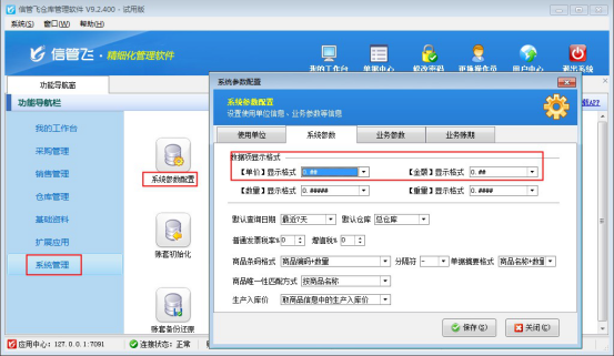 為滿足更多用戶可根據自身業務特點進行設置數據格式顯示的需求,信管飛倉庫管理軟件、信管飛送貨單軟件等支持數據項顯示格式的設置,以“信管飛倉庫管理軟件”為例,示范如何設置。登錄軟件,在功能導航窗點“系統管理”—》“系統參數設置”即可進入“系統參數設置”界面,點擊“系統參數”,如下圖所示: