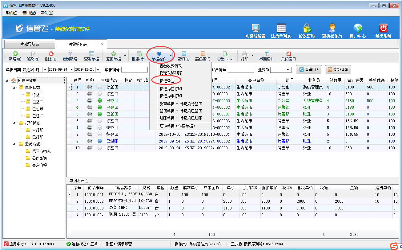 信管飛送貨單軟件支持對訂單列表、送貨單列表以及退貨單列表標記備注。本文介紹一下送貨單軟件中對送貨單列表標記備注的具體操作步驟。