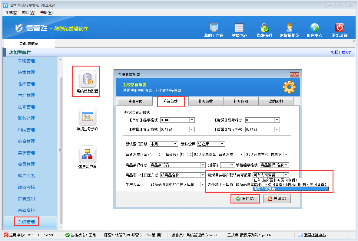 在功能導航窗中點擊“系統管理”—》“系統參數配置”,即可進入“系統參數設置”界面,其界面如下圖所示。此處我們把新增潛在客戶默認共享范圍設置為“所有人可查看”,然后點擊“保存”按鈕保存設置。