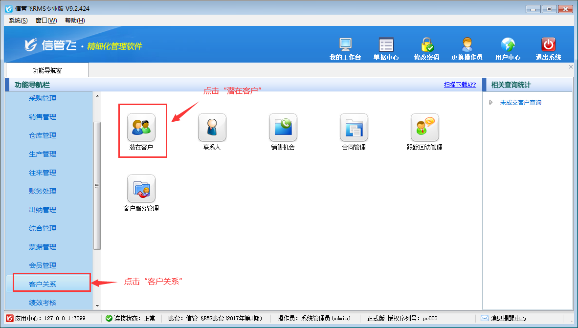 潛在客戶管理屬于客戶關系模塊,為信管飛RMS進銷存管理軟件)擴展模塊,如需使用,是需要另外購買的,可聯系在線客服進行咨詢試用。