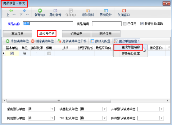 在“商品信息修改”窗口,點擊“單位及價格”,進入單位及價格界面,點擊“更改單位信息”——》“更改單位名稱”。具體步驟如下圖展示: