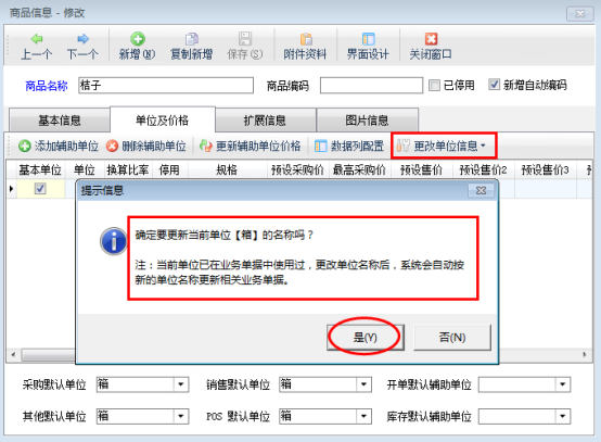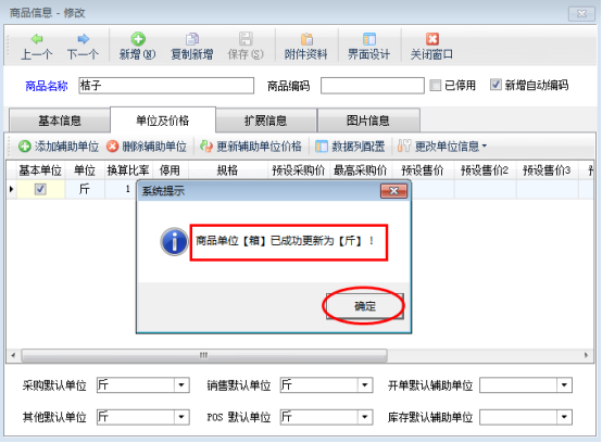 在圖3中,點擊“是”按鈕可以進行修改單位名稱,示例中是把單位“箱”修改為“斤”,修改后顯示為: