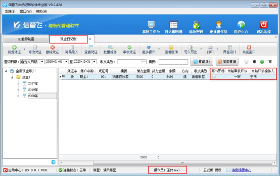 操作員“王偉”登錄軟件,新增一個現金日記賬,審核日記賬后,在日記賬列表界面,在界面設計中勾選顯示出“當前審核環節”,可看到顯示為一審。如下圖所示: