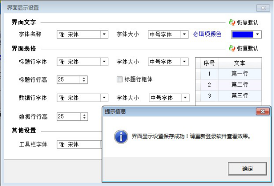界面風格中可調整標題行行高和數據行行高,字體顯示大小也可以進行修改。修改后重新登錄軟件會變為修改后的顯示,下圖為修改后顯示: