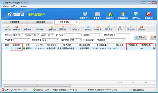 收款結算單用來登記收款信息(收款對象即客戶、收款賬戶、收款金額、經手人等),并結銷應收款記錄。本篇文章以信管飛RMS軟件為例演示一下對應收款進行收款結算的操作步驟。