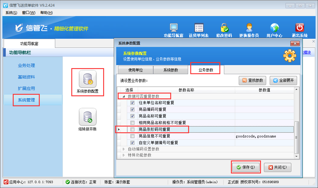 在系統管理—》系統參數配置—》業務參數內將“數據可否重復參數”中的“商品條形碼可重復”參數的勾選取消,然后保存設置。如下圖所示: