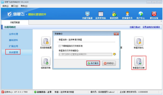 登錄客戶端電腦客戶端程序,在功能導(dǎo)航窗點(diǎn)擊“系統(tǒng)管理”—》“賬套備份還原”,會(huì)彈出賬套備份界面,直接點(diǎn)擊“執(zhí)行備份”操作,可對(duì)主機(jī)電腦進(jìn)行執(zhí)行備份操作,備份文件存在主機(jī)電腦賬套備份文件中,如下圖所示: