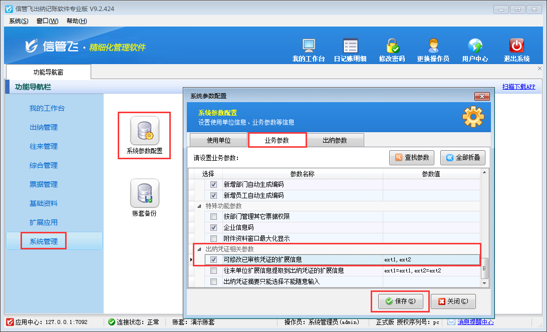 出納記賬軟件中默認不允許直接修改已審核憑證的擴展信息,但是如需修改已審核憑證的擴展信息,系統支持參數配置,如下圖所示,啟用參數:“可修改已審核憑證的擴展信息”,參數值可自定義,默認為“ext1,ext2(擴展信息1,擴展信息2)”,參數啟用后即可修改已審核憑證的擴展信息,但是如需普通操作員可修改已審核憑證的擴展信息,需要另外設置一下操作員權限,本文介紹一下如何設置操作員可修改已審核憑證擴展信息的操作權限?