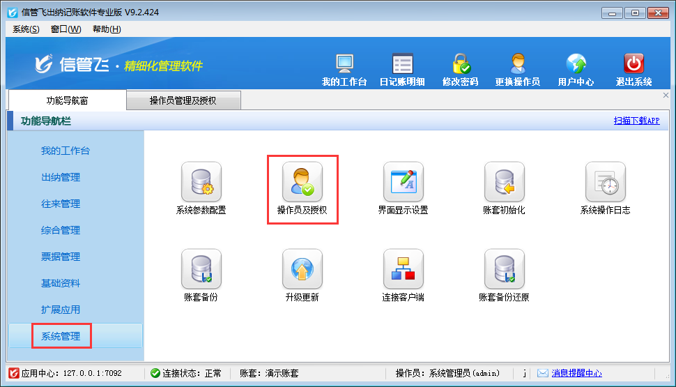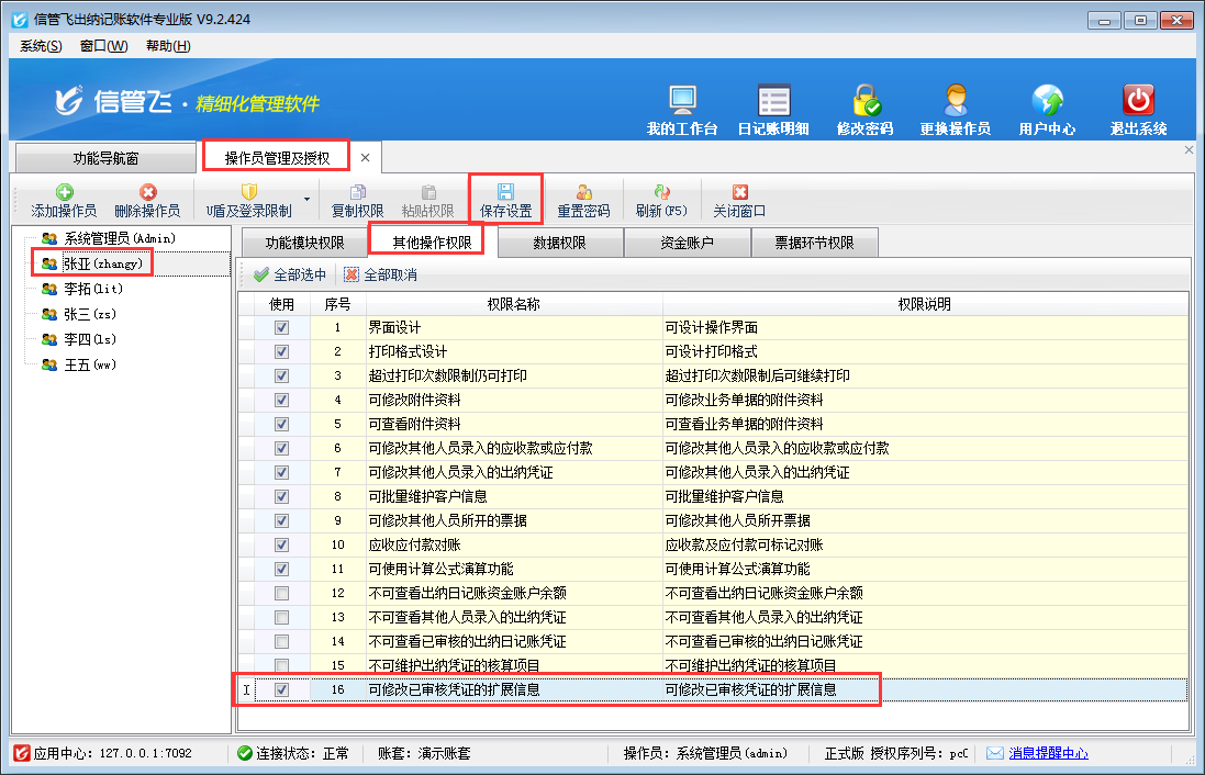 在功能導航窗點“系統管理”→“操作員及授權”即可進入“操作員管理及授權”界面,選中操作員賬號,在“其他操作權限”界面將“可修改已審核憑證的擴展信息”權限勾選上,然后保存權限設置即可。如下圖所示,設置操作員賬號“張亞”可修改已審核憑證的擴展信息。