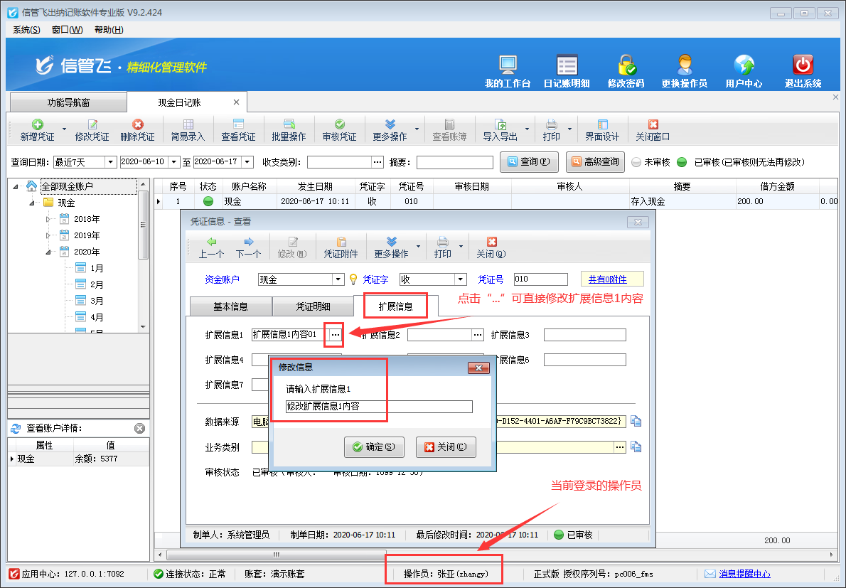 設置完成之后,我們使用操作員賬號“張亞”登陸軟件,然后在功能導航窗點擊“出納管理”→“現金日記賬”,打開一個已審核的現金日記賬憑證,然后點擊擴展信息頁面,在“擴展信息1”后的“...”按鈕可以直接修改擴展信息內容,如下圖所示:
