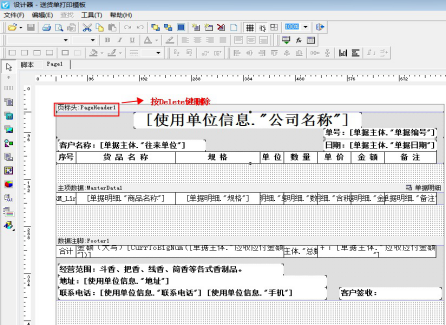 打開已開送貨單界面,在工具欄點(diǎn)擊打印—》打印格式設(shè)計(jì)進(jìn)入打印格式設(shè)計(jì)界面,選擇模板點(diǎn)擊“設(shè)計(jì)格式”,進(jìn)入模板設(shè)計(jì)器界面,在模板設(shè)計(jì)器中,單擊頁(yè)標(biāo)頭,按Delete鍵刪除頁(yè)標(biāo)頭,然后左邊工具欄點(diǎn)擊“插入邊框”,在表頭處插入“標(biāo)題”,然后往下拖動(dòng),覆蓋所有表頭內(nèi)容,保存模板即可。如下圖所示: