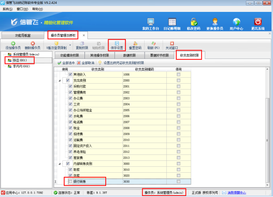 信管飛出納記賬軟件登記現金和銀行日記賬時,可以選擇收支類別,如果不想讓操作員看到所有的出納憑證,可以設置操作員僅能查看部分收支類別。本文介紹下如何設置操作員的收支類別權限?