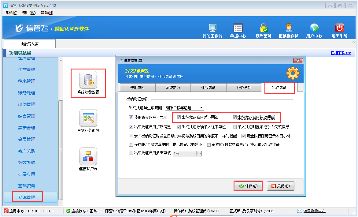 信管飛出納記賬軟件、信管飛RMS(標準版、專業版)中的出納管理模塊,在新增憑證中有的需要填寫輔助項目和憑證明細,軟件支持設置在新增憑證時顯示這些項目。下邊以信管飛RMS為例,演示一下如何設置出納憑證啟用憑證明細和輔助項目。