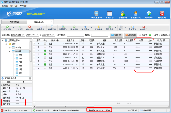 信管飛RMS標準版和專業版都包括出納管理模塊,都支持設置操作員不可查看出納日記賬資金賬戶余額權限,本篇文章以信管飛RMS專業版為例詳細介紹一下如何設置操作員不可查看出納日記賬資金賬戶余額。