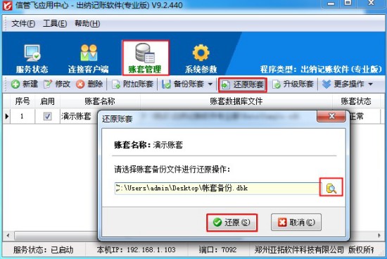 點(diǎn)擊“備份帳套”后會(huì)在桌面上生成一個(gè)名稱為“帳套備份.dbk”的文件(名稱可自己取),復(fù)制到新電腦上,在新電腦上安裝下軟件,軟件安裝包可在官網(wǎng)上下載(軟件下載地址),然后在應(yīng)用中心程序帳套管理界面點(diǎn)擊“還原帳套”,選擇復(fù)制過去的備份文件進(jìn)行還原,如下圖所示: