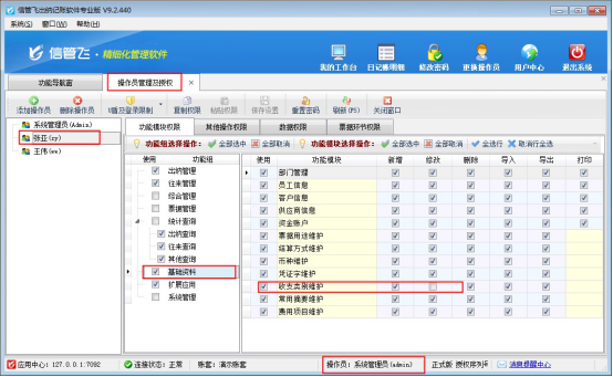 使用系統管理員賬號登錄軟件,在“系統管理”界面點擊“操作員及授權”,進入操作員管理及授權界面,選擇操作員“張亞”,功能模塊權限選擇“基礎資料”,基礎資料對應的“收支類別維護”權限中取消勾選修改權限,然后保存設置,如下圖所示: