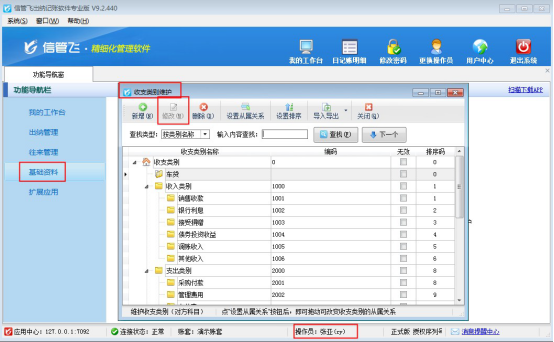 使用操作員“張亞”登錄軟件,打開基礎資料--收支類別維護界面,可看到修改按鈕為灰色顯示,無法修改,如下圖所示: