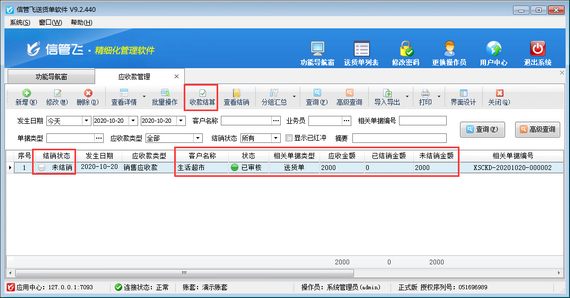 收款結算單用來登記收款信息(收款對象即客戶、收款賬戶、收款金額、經手人等),并結銷應收款記錄。正常情況下,應收金額為多少,客戶需支付我們多少貨款,但是部分情況下,客戶支付給我們貨款時可能因為各種原因只能給我們支付其中一部分,然后過段時間在支付剩余貨款。本篇文章以送貨單打印軟件為例演示一下部分收款的情況下如何開收款結算單。
