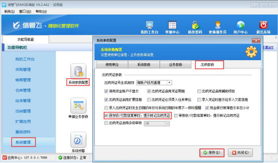 在功能導航窗點擊“系統管理”—》“系統參數配置”,選擇“出納參數”勾選上“保存收/付款結算單時,提醒轉記出納憑證”,如下圖所示: