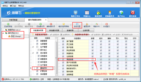 以信管飛倉(cāng)庫(kù)管理軟件為例,示范下如何設(shè)置操作員不能新增商品信息。