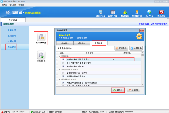 在業務參數界面將打印參數內“報表打印超過指定次數提示”勾選上,并將打印次數設置一下,軟件中默認的打印次數是1,可以根據自己的實際需求進行設置,最后進行保存。
