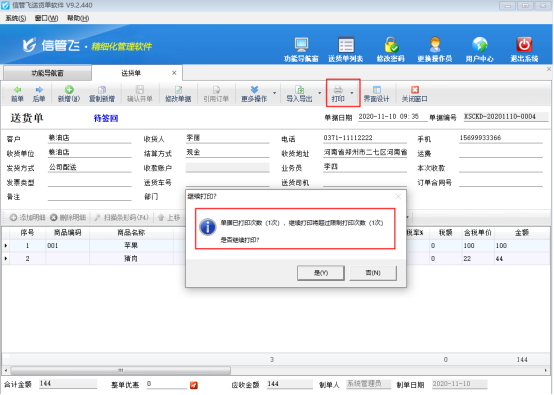 設置報表打印超過打印次數提示后,在業務單據打印時(基礎資料、統計查詢功能中沒有限制)如果單據打印的次數超過限制數量,系統會提示“單據已打印次數(1次),繼續打印將超過限制打印次數(1次),是否繼續打?”,如下圖所示: