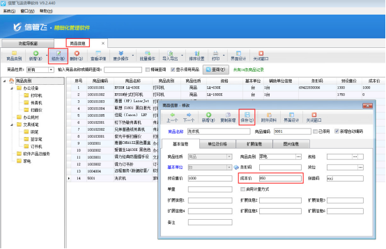 在功能導航窗點擊“基礎資料”—》“商品信息”打開商品信息界面,以商品“洗衣機”為例,選擇商品后點擊“修改”按鈕,錄入成本價為850元,再保存商品信息,如圖1所示。