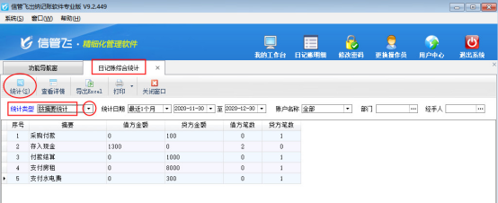 在“日記賬綜合統計”界面,統計類型選擇“按摘要統計”,然后點擊“統計”按鈕,可以根據摘要進行統計。另外,系統支持根據日期、賬戶名稱、部門、經手人等條件進行統計查詢。