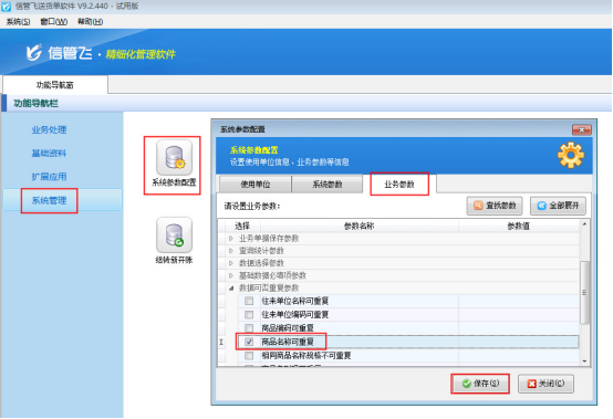 客戶(hù)遇到以上情況可通過(guò)設(shè)置商品名稱(chēng)可重復(fù)進(jìn)行解決。以信管飛送貨單軟件為例,在系統(tǒng)管理—》系統(tǒng)參數(shù)配置—》業(yè)務(wù)參數(shù)內(nèi)將“數(shù)據(jù)可否重復(fù)參數(shù)”中的“商品名稱(chēng)可重復(fù)”參數(shù)的勾選,然后保存設(shè)置。如下圖所示: