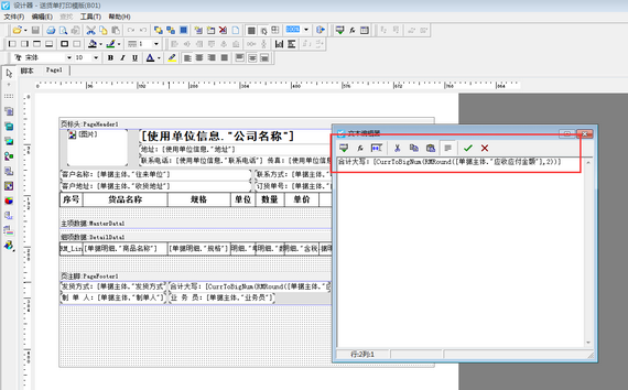 打開模版設(shè)計界面后,在模版合適的位置添加一個文本框,雙擊文本框打開文本編輯器,然后錄入內(nèi)容“[CurrToBigNum([RMRound([單據(jù)主體."應(yīng)收應(yīng)付金額"],2)])]”或者是通過“插入表達式”插入數(shù)字轉(zhuǎn)換人民幣大寫函數(shù),如下圖所示。