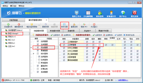 登錄軟件,在功能導(dǎo)航窗點(diǎn)擊“系統(tǒng)管理”—》“操作員及授權(quán)”,進(jìn)入“操作員管理及授權(quán)”界面,選擇操作員“張亞”,在其右側(cè)的功能模塊權(quán)限內(nèi)選擇“綜合管理”模塊,將工資單管理的“刪除”權(quán)限取消勾選,然后保存設(shè)置,如下圖所示。