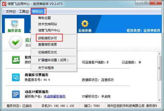 本文介紹下送貨單軟件如何授權(quán)為正式版,軟件安裝有兩個(gè)圖標(biāo)(紅色應(yīng)用中心圖標(biāo)和藍(lán)色客戶端圖標(biāo)),授權(quán)需要打開紅色應(yīng)用中心程序(打開后會(huì)在電腦右下角顯示),桌面右下角找到雙擊打開紅色應(yīng)用中心程序,在工具欄的“幫助”按鈕下點(diǎn)擊獲取授權(quán)許可,如下圖所示: