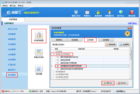 在功能導航窗選擇“系統(tǒng)管理”—》“系統(tǒng)參數(shù)配置”—》“業(yè)務(wù)參數(shù)”,進入業(yè)務(wù)參數(shù)設(shè)置界面,在“系統(tǒng)安全及權(quán)限參數(shù)”中勾選“啟用基礎(chǔ)資料數(shù)據(jù)項權(quán)限控制”參數(shù),然后保存參數(shù)配置,如下圖所示。