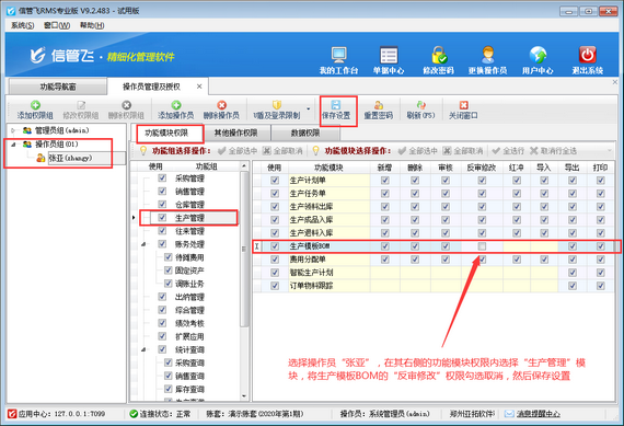 登錄軟件,在功能導(dǎo)航窗點擊“系統(tǒng)管理”—》“操作員及授權(quán)”,進入“操作員管理及授權(quán)”界面,選擇操作員“張亞”,在其右側(cè)的功能模塊權(quán)限內(nèi)選擇“生產(chǎn)管理”模塊,將生產(chǎn)模板BOM的“反審修改”權(quán)限勾選取消,然后保存設(shè)置,如下圖所示。