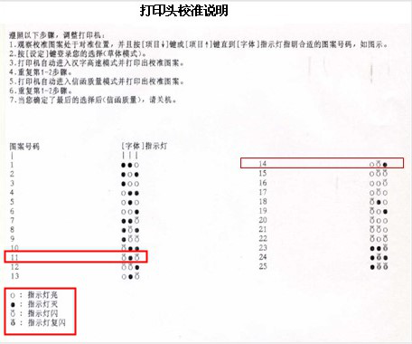 根據(jù)校準圖樣選擇打印頭校準的圖樣編號:例如:NO.11打印效果較好;使用【項目↓】鍵把字體指示燈調整成“打印頭校準說明”所示的狀態(tài)。例如:N0.11字體燈的狀態(tài)為“閃滅閃”。