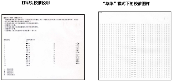 確保打印機已經關閉(當使用連續(xù)紙時,請確保已裝入打印紙并且打印機已關閉)。按住【暫!挎I的同時,打開打印機電源,打印機的缺紙燈和暫停燈亮。放入打印紙,打印出打印頭校準說明和草體模式下的校準圖樣,表示已進入“草體”校準模式,如下圖: